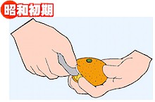 湯どうし(外皮の剥皮を容易にするために行う)したみかんの果梗部近くの肩を竹べらで剥ぎ取り、両方の指先で残りの部分を剥ぐ(果梗部を上にして左手にとり、右手に竹べらをもって蜜柑の肩の部分に当て、できるだけ外皮に浅くかけて、竹べらを手前に引くようにして外皮を剥ぐ) |